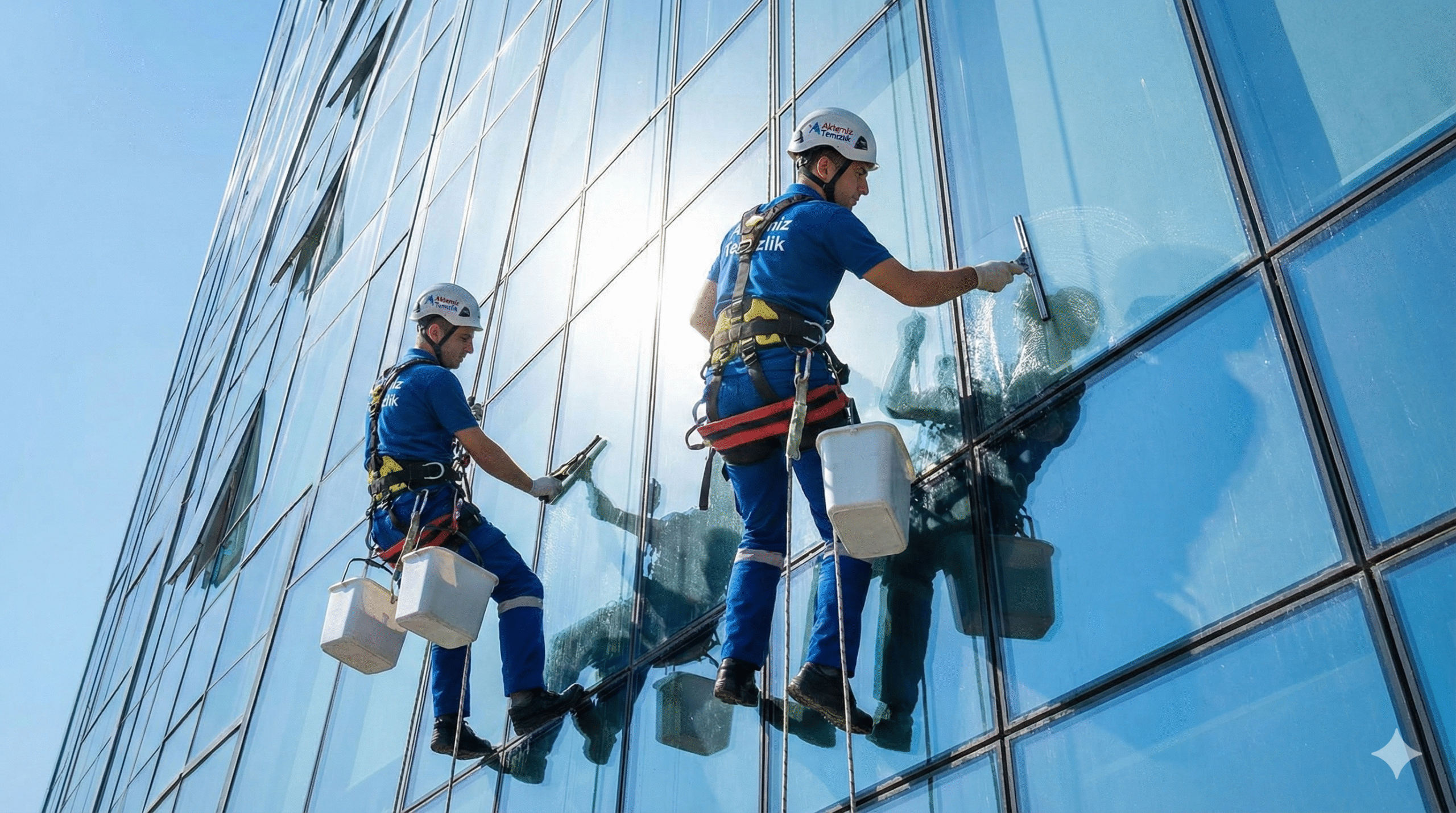 Yüksek binalar ve plazalar için iş güvenliğine uygun, iz bırakmayan parlak cam temizliği çözümleri.